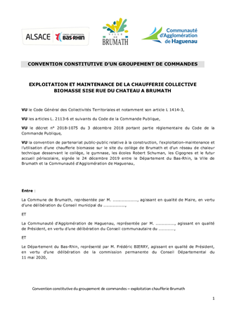 Proposition d'approbation de la convention de groupement de commandes conclue entre la Ville de BRUMATH, la Communauté d'Agglomération de Haguenau et le Département du Bas-Rhin en vue de l'exploitation de maintenance de la chaufferie collective biomasse à construire sur le site du collège de BRUMATH et d'un réseau de chaleur technique desservant le collège, le Gymnase, les écoles Robert Schuman, les Cigognes et le futur accueil périscolaire.