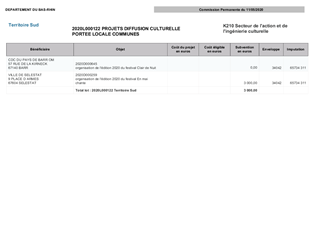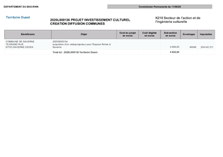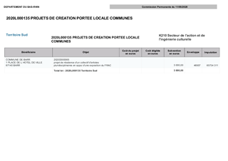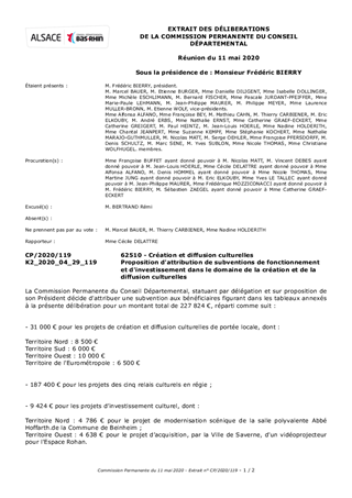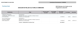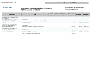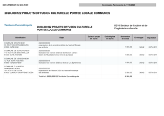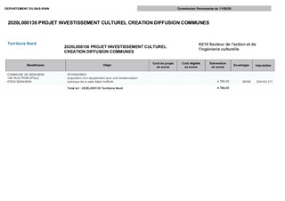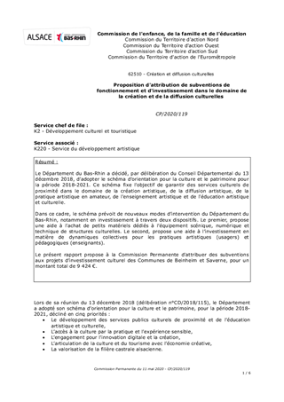 Le Département du Bas-Rhin a décidé, par délibération du Conseil Départemental du 13 décembre 2018, d’adopter le schéma d’orientation pour la culture et le patrimoine pour la période 2018-2021. Ce schéma fixe l’objectif de garantir des services culturels de proximité dans le domaine de la création artistique, de la diffusion artistique, de la pratique artistique en amateur, de l'enseignement artistique et de l'éducation artistique et culturelle. Dans ce cadre, le schéma prévoit de nouveaux modes d’intervention du Département du Bas-Rhin, notamment en investissement à travers deux dispositifs. Le premier, propose une aide à l’achat de petits matériels dédiés à l’équipement scénique, numérique et technique de structures culturelles. Le second, propose une aide à l’investissement en matière de dynamiques collectives pour les pratiques artistiques (usagers) et pédagogiques (enseignants). Le présent rapport propose à la Commission Permanente d'attribuer des subventions aux projets d’investissement culturel des Communes de Beinheim et Saverne, pour un montant total de 9 424 €.