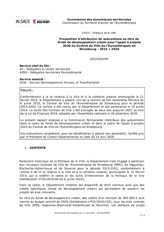 Conformément à la loi relative à la Ville et à la cohésion urbaine promulguée le 21 février 2014, le Département a adopté, lors de la réunion de son Assemblée Plénière du 6 juillet 2015, le Contrat de Ville de l’Eurométropole de Strasbourg pour la période 2015-2020. Ce contrat a été conclu par le Département et ses partenaires le 10 juillet 2015. La durée des Contrats de Ville a été prorogée de deux ans jusqu’en 2022 au titre de la Loi de Finances 2019, adoptée par l'Assemblée nationale le 20 décembre 2018. Le présent rapport propose à la Commission Permanente d’attribuer des subventions dans le cadre du fonds de développement urbain et dans le cadre de l’appel à projets 2020 du Contrat de Ville de l’Eurométropole de Strasbourg. Ces subventions complètent, pour les bénéficiaires à statuts non associatifs, l’arrêté pris par le Président du Conseil Départemental en date du 14 avril 2020.