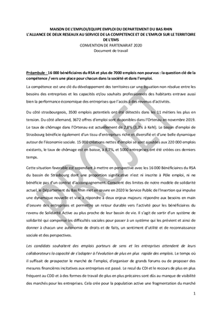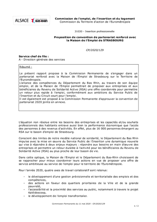 Le présent rapport propose à la Commission Permanente de s’engager dans un partenariat renforcé avec la Maison de l’Emploi de Strasbourg sur le Territoire de l’Eurométropole. L’alliance des compétences du Département du Bas Rhin, au travers de son équipe emploi, et de la Maison de l’Emploi permettrait de proposer aux entreprises et aux bénéficiaires du Revenu de Solidarité Active (RSA) une offre coordonnée pour permettre un retour plus rapide à l’emploi, conformément aux ambitions du Service Public de l’Insertion et du Circuit court pour l’emploi. Il est également est proposé à la Commission Permanente d’approuver la convention de partenariat 2020 jointe en annexe.