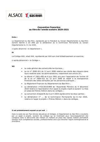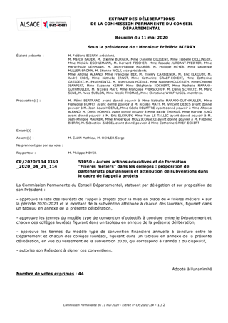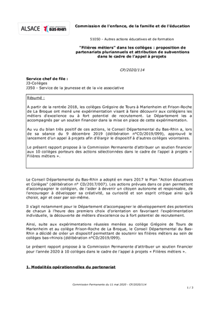 A partir de la rentrée 2018, les collèges Grégoire de Tours à Marlenheim et Frison-Roche de La Broque ont mené une expérimentation visant à faire découvrir aux collégiens les métiers d'excellence ou à fort potentiel de recrutement. Le Département les a accompagnés par un soutien financier dans la mise en place de cette expérimentation. Au vu du bilan très positif de ces actions, le Conseil Départemental du Bas-Rhin a, lors de sa séance du 9 décembre 2019 (délibération n°CD/2019/099), approuvé le lancement d’un appel à projets afin d’élargir le dispositif à d’autres collèges volontaires. Le présent rapport propose à la Commission Permanente d’attribuer un soutien financier aux 10 collèges porteurs des actions sélectionnées dans le cadre de l’appel à projets « Filières métiers ».