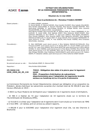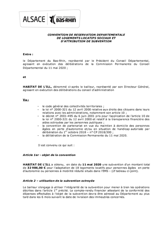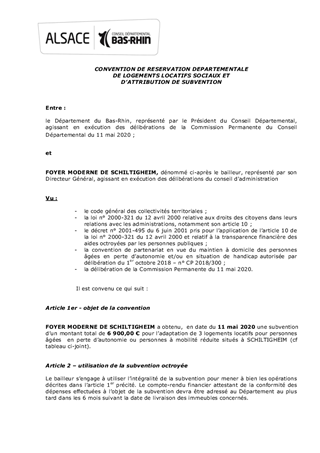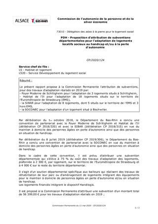Le présent rapport propose à la Commission Permanente l’attribution de subventions, pour des travaux d'adaptation réalisés en 2019 par: - Foyer Moderne de Schiltigheim pour l’adaptation de 3 logements situés à Schiltigheim, - Habitat de l'Ill pour l'adaptation de 18 logements situés sur le territoire de l'Eurométropole de Strasbourg (EMS), - la SIBAR pour l'adaptation de 8 logements, dont 5 situés sur le territoire de l'EMS et 3 hors EMS, - la SOCONEC pour l'adaptation d'un logement situé à Bischwiller.