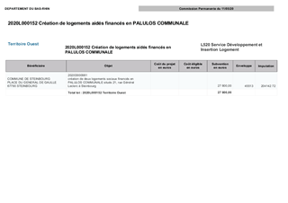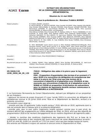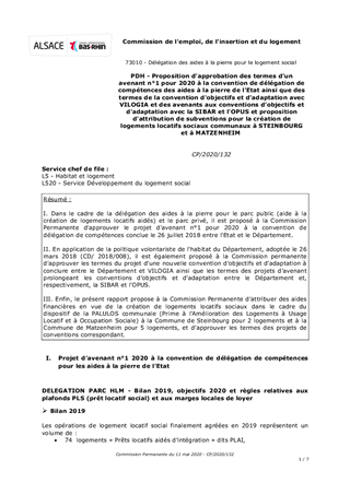 PDH - Proposition d'approbation des termes d'un avenant n°1 pour 2020 à la convention de délégation de compétences des aides à la pierre de l'Etat ainsi que des termes de la convention d'objectifs et d'adaptation avec VILOGIA et des avenants aux conventions d'objectifs et d'adaptation avec la SIBAR et l'OPUS et proposition d'attribution de subventions pour la création de logements locatifs sociaux communaux à STEINBOURG et à MATZENHEIM