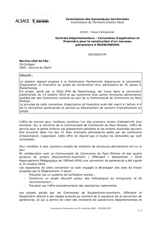 Le présent rapport propose à la Commission Permanente d’approuver la convention d’application et financière du projet de construction d’un périscolaire de 70 places à Roeschwoog. Ce projet, porté par le SIVU RPU de Roeschwoog, est inclus dans la convention partenariale du 14 octobre 2019 et qui comprend trois autres structures périscolaires portées par des Communes voisines au sein de la Communauté de Communes du Pays Rhénan. Le principe de cette convention d’application et financière avait été inscrit à l’article 4.4 de la convention partenariale et permet au Département de soutenir financièrement ce projet.