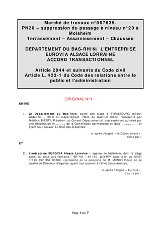 PN20 MOLSHEIM Proposition de protocole d'accord transactionnel concernant le marché N°007635 de travaux de terrassements-assainissement et chaussées