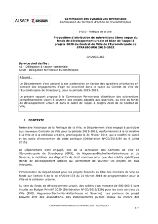 Le Département s’est associé à ses partenaires en faveur des quartiers prioritaires en prenant des engagements d’agir en proximité dans le cadre du Contrat de Ville de l’Eurométropole de Strasbourg, pour la période 2015-2022. Le présent rapport propose à la Commission Permanente d’attribuer des subventions complémentaires visant à soutenir des projets adaptés aux quartiers, au titre du fonds de développement urbain et dans le cadre de l’appel à projets 2020 de ce Contrat de Ville.