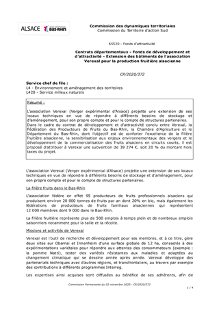 L’association Verexal (Verger expérimental d’Alsace) projette une extension de ses locaux techniques en vue de répondre à différents besoins de stockage et d’aménagement, pour son propre compte et pour le compte de structures partenaires. Dans le cadre du contrat de développement et d’attractivité conclu entre Verexal, la Fédération des Producteurs de Fruits du Bas-Rhin, la Chambre d’Agriculture et le Département du Bas-Rhin, dont l’objectif est de conforter l’excellence de la filière fruitière alsacienne, la sensibilisation aux enjeux environnementaux des vergers et le développement de la commercialisation des fruits alsaciens en circuits courts, il est proposé d’attribuer à Verexal une subvention de 39 274 €, soit 20 % du montant hors taxes du projet.