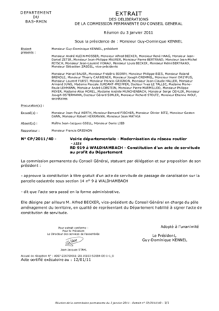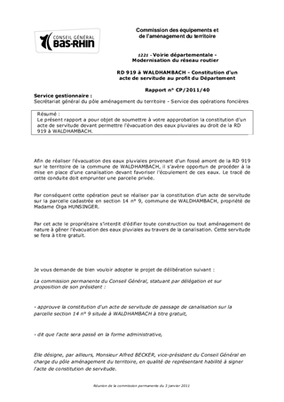 Le présent rapport a pour objet de soumettre à votre appprobation la constitution d'un acte de servitude devant permettre l'évacuation des eaux pluviales au droit de la RD 919 à WALDHAMBACH.