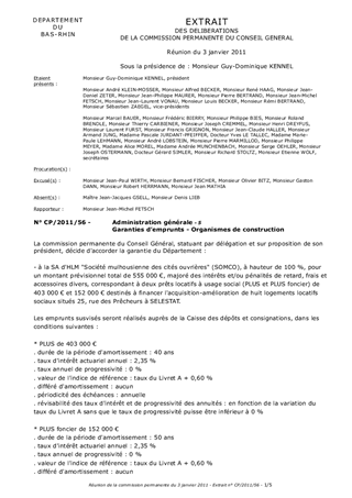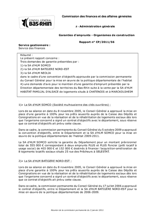 Le présent rapport concerne : Trois demandes de garantie présentées par : 1)-la SA dHLM SOMCO 2)-la SA dHLM BATIGERE NORD-EST 3)-la SA dHLM NEOLIA dans le cadre dune convention dobjectifs approuvée par la commission permanente du Conseil Général pour la mise en uvre de la politique départementale de lhabitat 4)-une demande davis pour le maintien dune garantie demprunt présentée par la Direction départementale des territoires du Bas-Rhin suite à la vente par la SA dHLM HABITAT FAMILIAL DALSACE de logements situés à CHATENOIS et à MARCKOLSHEIM