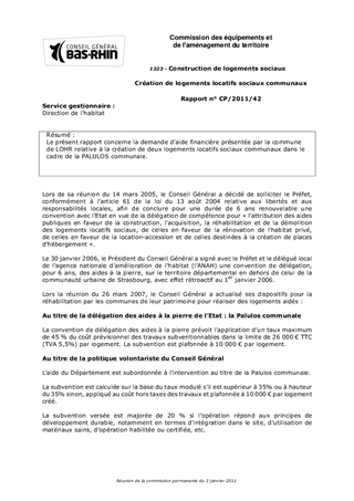 Le présent rapport concerne la demande daide financière présentée par la commune de LOHR relative à la création de deux logements locatifs sociaux communaux dans le cadre de la PALULOS communale.