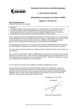 Le présent rapport a pour objet d'autoriser le président du Conseil Général à assurer le remboursement auprès du département du Haut-Rhin de la moitié de la note d'honoraires émise par le cabinet d'avocats JACQUIN-MARUANI dans le cadre de la renégociation du bail consenti au sein de la Maison de l'Alsace à Paris