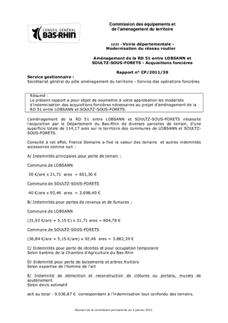 Le présent rapport a pour objet de soumettre à votre approbation les modalités dindemnisation des acquisitions foncières nécessaires au projet daménagement de la RD 51 entre LOBSANN et SOULTZ-SOUS-FORETS.