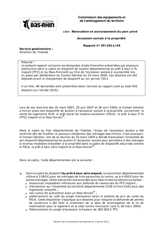 Le présent rapport concerne les demandes daide financière présentées par plusieurs particuliers dans le cadre du dispositif de soutien départemental au prêt à taux 0 % majoré (PTZ) et du Pass-Foncier® au titre de laccession sociale à la propriété mis en place par délibération du Conseil Général du 23 mars 2009. Ces dossiers ont été déposés avant le changement de dispositif au 1er janvier 2011. A ce titre, 88 demandes sont présentées dans lannexe au rapport (soit au total 692 dossiers sur l'année 2010).