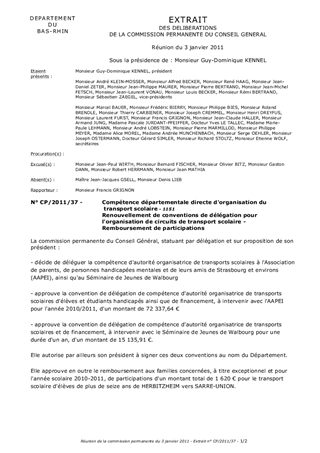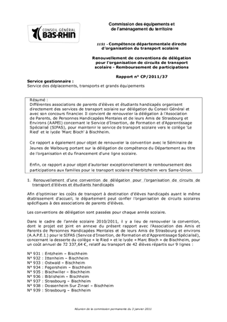 Différentes associations de parents d'élèves et étudiants handicapés organisent directement des services de transport scolaire sur délégation du Conseil Général et avec son concours financier. Il convient de renouveler la délégation à l'Association de Parents, de Personnes Handicapées Mentales et de leurs Amis de Strasbourg et Environs (AAPEI) concernant le Service d'Insertion, de Formation et d'Apprentissage Spécialisé (SIFAS), pour maintenir le service de transport scolaire vers le collège 'Le Ried' et le lycée 'Marc Bloch' à Bischheim. Ce rapport a également pour objet de renouveler la convention avec le Séminaire de Jeunes de Walbourg portant sur la délégation de compétence du Département au titre de l'organisation et du financement d'une ligne scolaire. Enfin, ce rapport a pour objet d'autoriser exceptionnellement le remboursement des participations aux familles pour le transport scolaire d'Herbitzheim vers Sarre-Union.