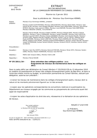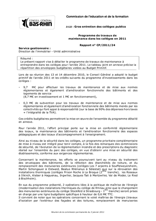 Le présent rapport vise à détailler le programme de travaux de maintenance à entreprendre dans les collèges pour lannée 2011. Le tableau joint en annexe précise la répartition des enveloppes budgétaires votées au Budget Primitif.