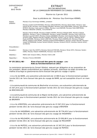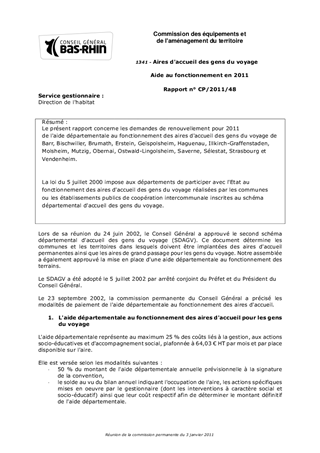 Le présent rapport concerne les demandes de renouvellement pour 2011 de l'aide départementale au fonctionnement des aires d'accueil des gens du voyage de Barr, Bischwiller, Brumath, Erstein, Geispolsheim, Haguenau, Illkirch-Graffenstaden, Molsheim, Mutzig, Obernai, Ostwald-Lingolsheim, Saverne, Sélestat, Strasbourg et Vendenheim. La loi du 5 juillet 2000 impose aux départements de participer avec l'Etat au fonctionnement des aires d'accueil des gens du voyage réalisées par les communes ou les établissements publics de coopération intercommunale inscrites au schéma départemental d'accueil des gens du voyage.