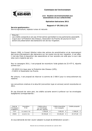 Les crédits consacrés à cet axe d'intervention permettent à nos partenaires associatifs (Ligue pour la Protection des Oiseaux, Association les Piverts) de poursuivre leurs actions de préservation des batraciens lors de leur migration.