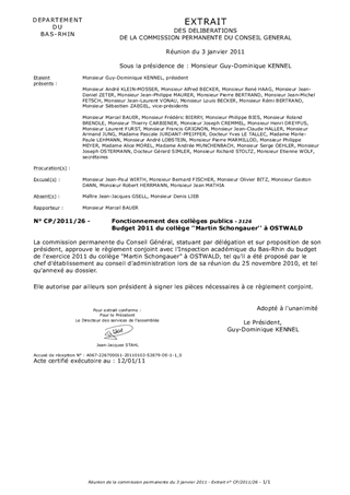 Règlement conjoint entre l'Inspection Académique du Bas-Rhin et le Conseil Général du Bas-Rhin du budget 2011 du collège d'Ostwald