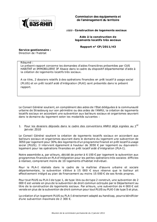 Le présent rapport concerne les demandes d'aides financières présentées par CUS HABITAT et IMMOBILIERE 3F Alsace dans le cadre du dispositif départemental d'aide à la création de logements locatifs très sociaux. A ce titre, 2 dossiers relatifs à des opérations financées en prêt locatif à usage social (PLUS) et en prêt locatif aidé d'intégration (PLAI) sont présentés dans le présent rapport.
