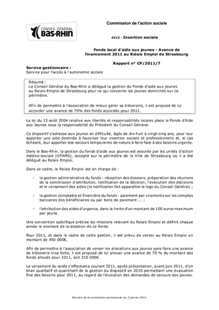Le Conseil Général du Bas-Rhin a délégué la gestion du Fonds daide aux jeunes au Relais Emploi de Strasbourg pour ce qui concerne les jeunes domiciliés sur ce périmètre. Afin de permettre à lassociation de mieux gérer sa trésorerie, il est proposé de lui accorder une avance de 70% des fonds accordés pour 2011.