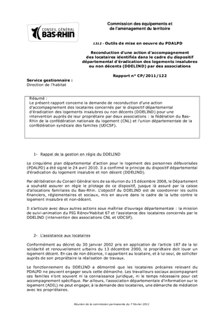 Le présent rapport concerne la demande de reconduction d'une action d'accompagnement des locataires concernés par le dispositif départemental d'éradication des logements insalubres ou non décents (DDELIND) pour une intervention auprès de leur propriétaire par deux associations : la fédération du Bas-Rhin de la confédération nationale du logement (CNL) et l'union départementale de la confédération syndicale des familles (UDCSF).