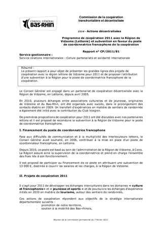 Le présent rapport a pour objet de présenter les grandes lignes des projets de coopération avec la région lettone de Vidzeme pour 2011 et de proposer l'attribution d'une subvention à la Région pour le poste de coordonnatrice francophone de la coopération.
