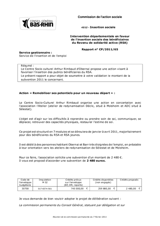 Le Centre Socio culturel Arthur Rimbaud dObernai propose une action visant à favoriser linsertion des publics bénéficiaires du RSA. Le présent rapport a pour objet de soumettre à votre validation le montant de la subvention 2011 le concernant.