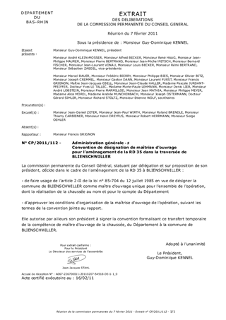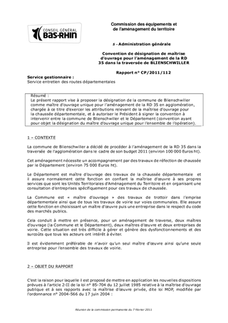 Convention de désignation de maîtrise douvrage pour laménagement de la RD 35 dans la traversée de BLIENSCHWILLER