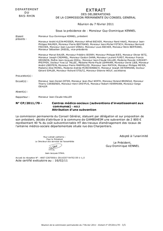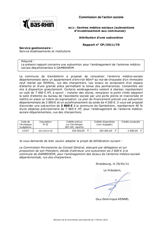 Le présent rapport concerne une subvention pour l'aménagement de l'antenne médico-sociale départementale à GAMBSHEIM.