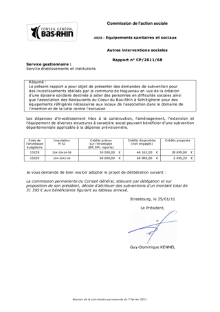 Le présent rapport a pour objet de présenter des demandes de subvention pour des investissements réalisés par la commune de Haguenau en vue de la création d'une épicerie solidaire destinée à aider des personnes en difficultés sociales ainsi que l'association des Restaurants du Coeur du Bas-Rhin à Schiltigheim pour des équipements réfrigérés nécessaires aux locaux de l'association dans le domaine de l'insertion et de la lutte contre l'exclusion