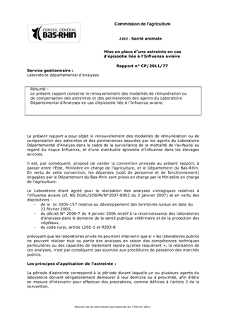 Le présent rapport concerne le renouvellement des modalités de rémunération ou de compensation des astreintes et des permanences des agents du Laboratoire Départemental dAnalyses en cas d'épizootie liée à l'Influenza aviaire.