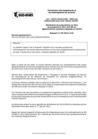 Le présent rapport vise à proposer ladoption dun nouveau programme daménagement de routes départementales en traverses dagglomération (subventions de type « bordures et caniveaux »-dossiers déposés en 2010).