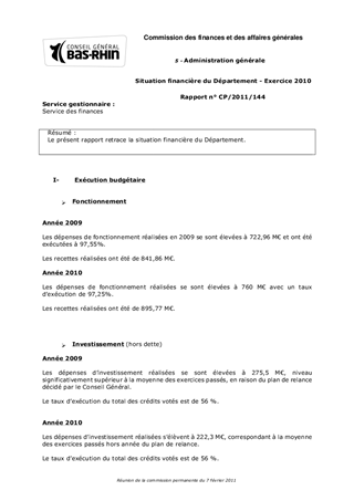 Situation financière du Département - Exercice 2010 Resumé Le présent rapport retrace la situation financière du Département. Pièces jointes Délibération Rapport Assemblée : Commission Permanente Date : 07/02/2011 Rapporteur : Monsieur Bernard FISCHER Collectivité : Conseil départemental du Bas-Rhin Direction : Direction des finances et de la commande publique Service : Service des finances Domaine : Non renseigné Commission : L - Commission des finances et des affaires générales