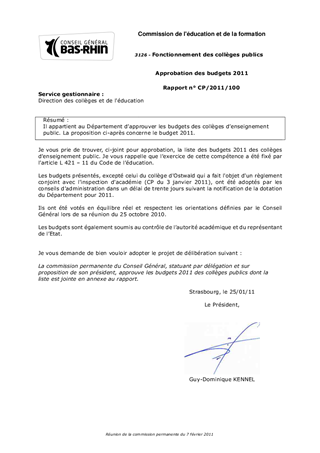 Il appartient au Département dapprouver les budgets des collèges denseignement public. La proposition ci-après concerne le budget 2011.