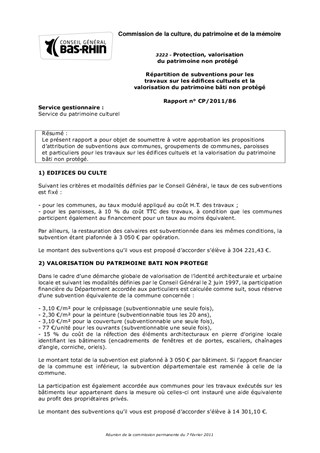 Le présent rapport a pour objet de soumettre à votre approbation les propositions d’attribution de subventions aux communes, groupements de communes, paroisses et particuliers pour les travaux sur les édifices cultuels et la valorisation du patrimoine bâti non protégé.