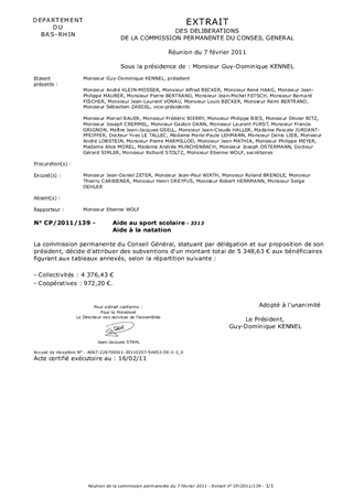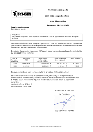 Aide à la natation Resumé Le présent rapport a pour objet de soumettre à votre approbation les aides au sport scolaire. Pièces jointes Délibération Rapport Assemblée : Commission Permanente Date : 07/02/2011 Rapporteur : Monsieur Etienne WOLF Collectivité : Conseil départemental du Bas-Rhin Direction : Direction de la jeunesse et des sports Service : Service des sports Domaine : Non renseigné Commission : K - Commission des sports
