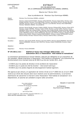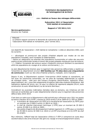Le présent rapport concerne la demande de subvention de fonctionnement de l'association AVA habitat et nomadisme, pour l'année 2011.