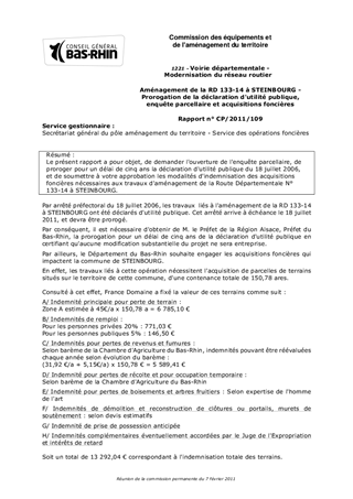 Le présent rapport a pour objet, de demander l'ouverture de l'enquête parcellaire, de proroger pour un délai de cinq ans la déclaration d'utilité publique du 18 juillet 2006, et de soumettre à votre approbation les modalités d'indemnisation des acquisitions foncières nécessaires aux travaux d'aménagement de la Route Départementale N° 133-14 à STEINBOURG.