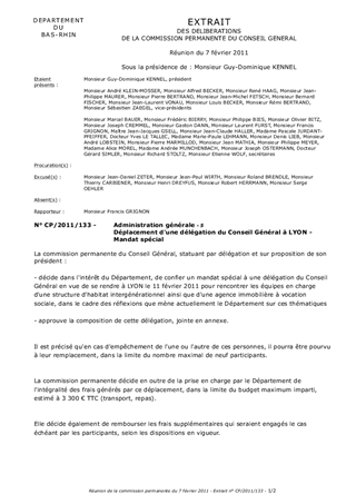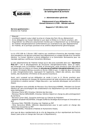 Le présent rapport a pour objet la prise en charge des frais liés au déplacement d'une délégation du Conseil Général à Lyon dans le Rhône le 11 février prochain, afin d'approfondir les réflexions actuellement menées par le Département sur la thématique de l'habitat intergénérationnel conformément aux orientations du plan départemental de l'habitat, de la politique jeunesse et du schéma départemental gérontologique.