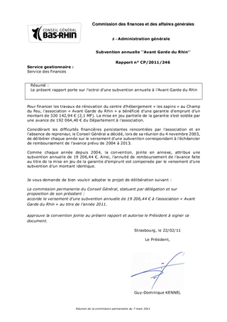 Subvention annuelle ''Avant Garde du Rhin'' Resumé Le présent rapport porte sur loctroi dune subvention annuelle à lAvant Garde du Rhin Pièces jointes Délibération Rapport Assemblée : Commission Permanente Date : 07/03/2011 Rapporteur : Monsieur Bernard FISCHER Collectivité : Conseil départemental du Bas-Rhin Direction : Direction des finances et de la commande publique Service : Service des finances Domaine : Non renseigné Commission : L - Commission des finances et des affaires générales