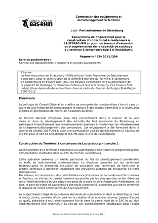 Le Port Autonome de Strasbourg (PAS) sollicite laide financière du Département dune part, pour la construction de la première tranche du Terminal à conteneurs de Lauterbourg et dautre part, pour les travaux dextension et daugmentation de la capacité de stockage du Terminal conteneurs Sud à Strasbourg. Ces travaux font lobjet dune demande de subventions dans le cadre du Contrat de Projets Etat-Région 2007-2013.