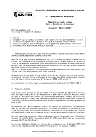 Ce rapport a pour objet de soumettre à votre approbation les participations financières aux frais d'enseignement des écoles de musique et de danse communales et associatives agréées du Bas-Rhin pour l'année 2011 ainsi que l'aide aux associations oeuvrant dans le domaine des musiques actuelles.