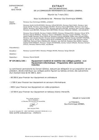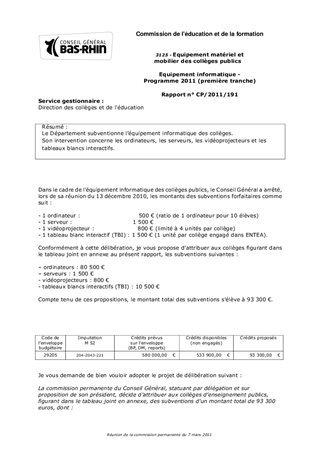 Le Département subventionne léquipement informatique des collèges. Son intervention concerne les ordinateurs, les serveurs, les vidéoprojecteurs et les tableaux blancs interactifs.