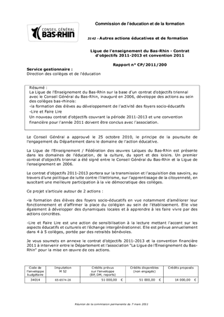 Ligue de l'enseignement du Bas-Rhin - Contrat d'objectifs 2011-2013 et convention 2011