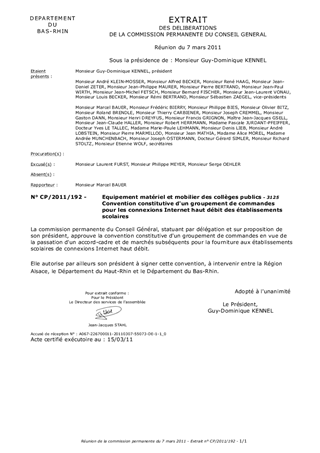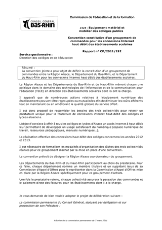 La convention jointe a pour objet de définir la constitution d'un groupement de commandes entre la Région Alsace, le Département du Bas-Rhin, et le Département du Haut-Rhin pour les connexions internet haut débit des établissements scolaires.