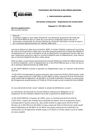 Le présent rapport a pour objet dexaminer une demande de garantie formulée par la SA dHLM NEOLIA dans le cadre de la convention dobjectifs approuvée par la commission permanente du Conseil Général du 19 février 2010 pour la mise en uvre de la politique départementale de lhabitat 2008-2010