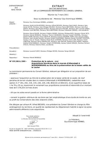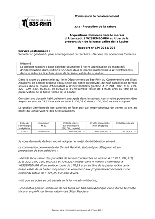 Le présent rapport a pour objet de soumettre à votre approbation les modalités dindemnisation dacquisitions foncières dans le marais dAltenstadt à WISSEMBOURG dans le cadre de la préservation de la basse vallée de la Lauter.