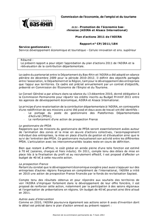 Le présent rapport a pour objet lapprobation du plan dactions 2011 de lADIRA et la réévaluation de la contribution départementale.