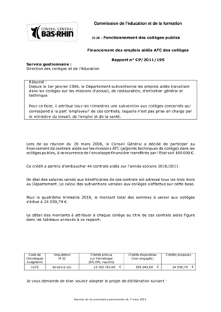 Depuis le 1er janvier 2006, le Département subventionne les emplois aidés travaillant dans les collèges sur les missions d'accueil, de restauration, d'entretien général et technique. Pour ce faire, il attribue tous les trimestres une subvention aux collèges concernés qui correspond à la part 'employeur' de ces contrats, laquelle n'est pas prise en charge par le ministère du travail, de l'emploi et de la santé.