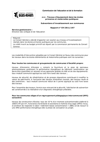 Le Conseil Général a décidé d'apporter son soutien aux travaux d'investissement réalisés dans les écoles primaires publiques par les communes. Le crédit inscrit au budget primitif est réparti par la commission permanente du Conseil Général.